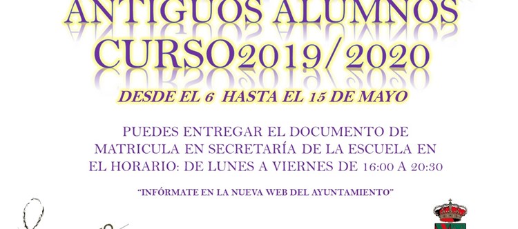 MATRICULACIÓN PARA ALUMNOS DE LA ESCUELA MUNICIPAL DE MÚSICA Y DANZA. DESDE EL 6 HASTA EL 15 DE MAYO. PODÉIS DESCARGAR EL DOCUMENTO Y ENVIARLO AL CORREO DE LA ESCUELA DEBIDAMENTE CUMPLIMENTADO O ENTREGARLO PERSONALMENTE EN LA SECRETARÍA DE LA ESCUELA, DE LUNES A VIERNES DE 16:00 A 20:30 HORAS.