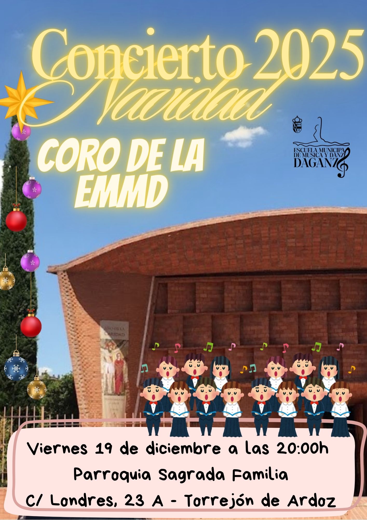 El viernes 19 de diciembre el Coro de la EMMD dará un concierto en La Parroquia Sagrada Familia de Torrejón de Ardoz a las 20:00h.