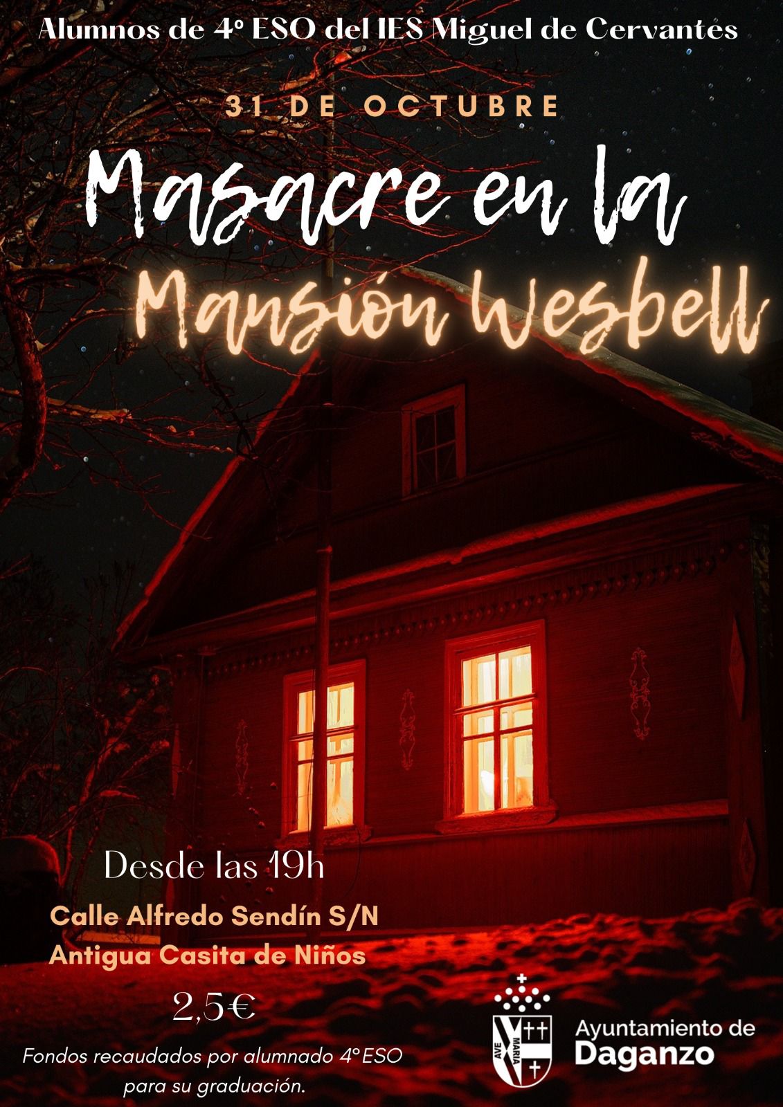 - ”MASACRE EN LA MANSIÓN WESBELL” Pasaje del terror a partir de las 19h en la antigua Casita de Niños (Calle Alfredo Sendín s/n), organizado por los alumnos de 4° ESO y las Concejalías de Cultura y Juventud.
