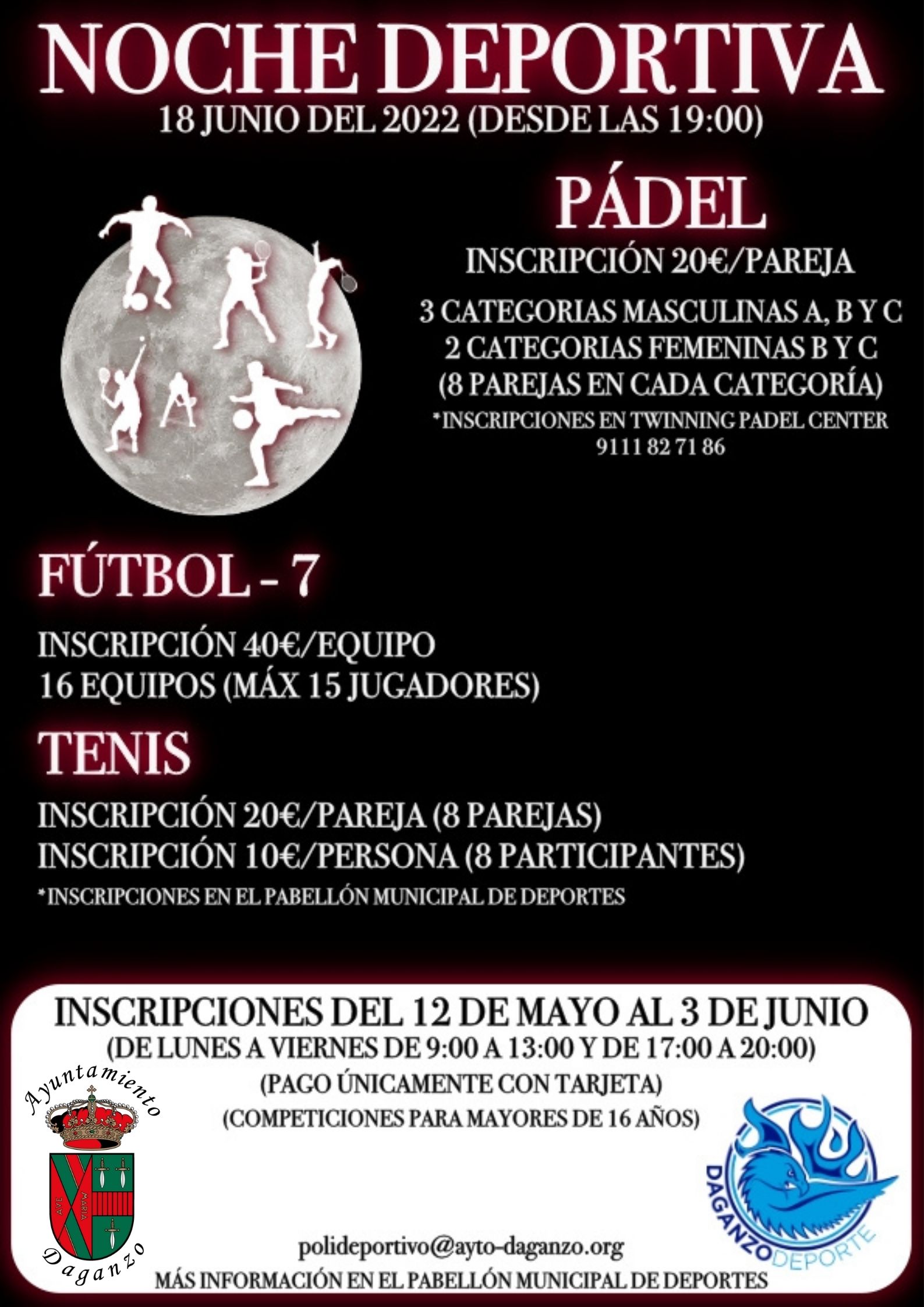 Inscripciones en el Pabellón Municipal a partir del 12 de mayo, de lunes a viernes, de 9:00 a 13:00 horas y de 17:00 a 20:00 horas, excepto pádel que se realizaran en Twinning Padel Center.