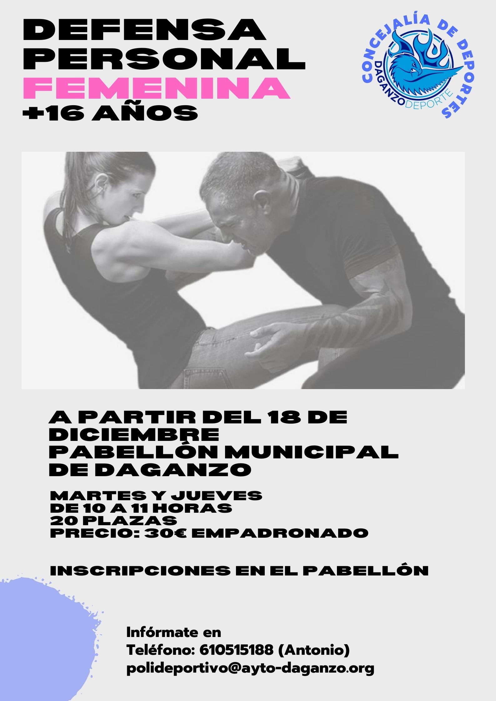 A partir del día 18 de Enero comenzamos con una nueva escuela de Defensa Personal Femenina. Se impartirá en el Pabellón Municipal los martes y jueves por la mañana de 10 a 11 horas.