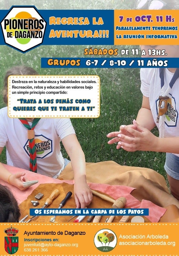El Ayuntamiento, desde la Concejalía de Juventud e Infancia y junto a la Asociación Arboleda, saca la tercera edición de la actividad “Pioneros de Daganzo”, una alternativa de ocio, dirigida a la infancia de nuestro municipio, que fomenta los valores positivos para la convivencia.