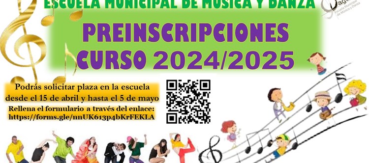 Les informamos que desde el 15 de abril a las 15:30 hasta el 5 de mayo ambos inclusive, podrán realizar las preinscripciones para obtener plaza en la Escuela Municipal de Música y Danza de Daganzo para el curso 2024-25.