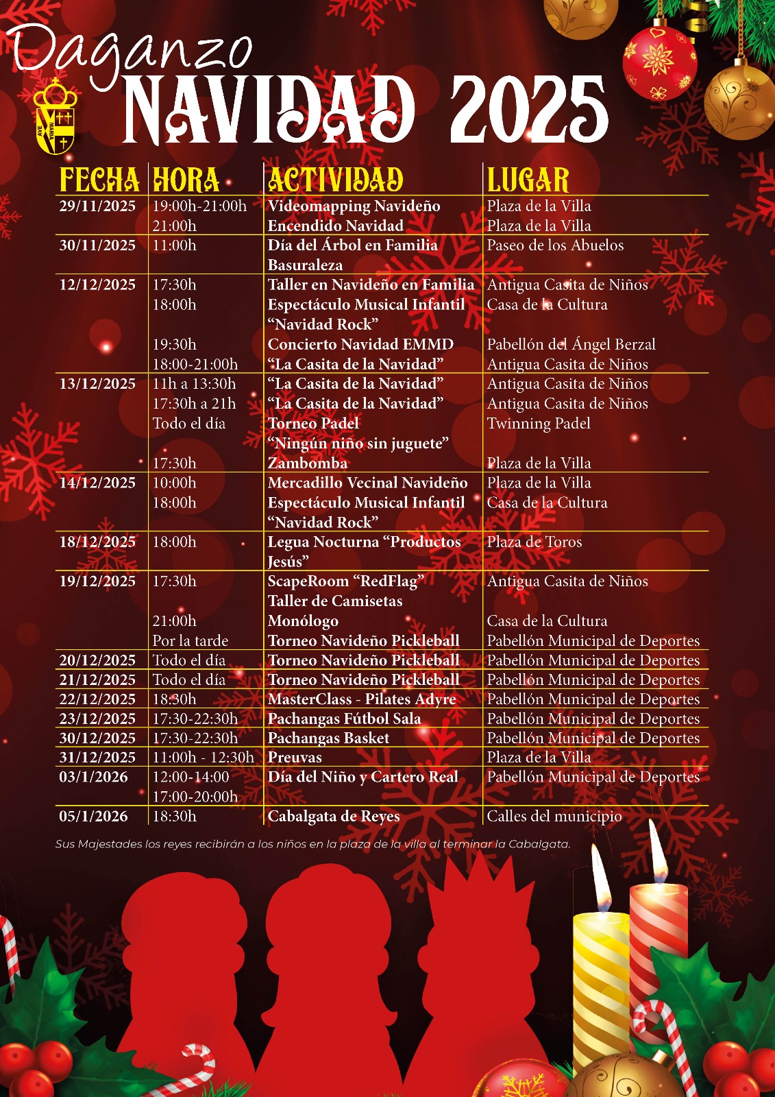 Llega una de las épocas más especiales del año y en Daganzo lo celebramos con una programación llena de magia: videomapping, encendido de luces, talleres en familia, espectáculos infantiles, deporte, mercadillo navideño, actividades solidarias, monólogos y mucho más.