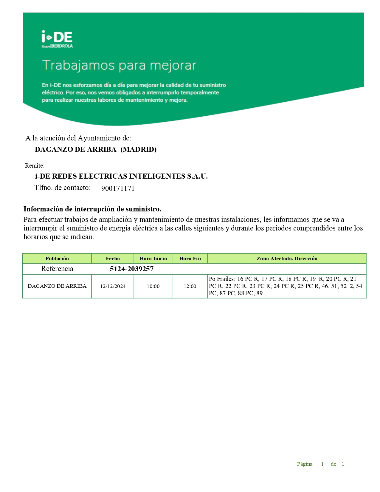 Desde el grupo IBERDROLA i-DE REDES ELÉCTRICAS INTELIGENTES S.A.U , nos informan de la interrupción de suministro por ampliación y mantenimiento de sus instalaciones.