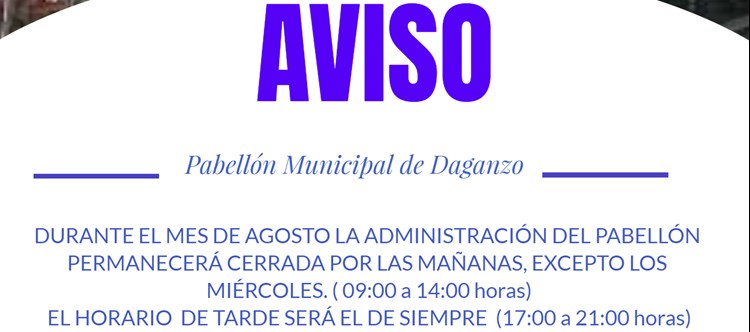 Durante el mes de agosto, la administración del Pabellón permanecerá cerrada por las mañanas excepto los miércoles que se abrirá en horario de 09:00 a 14:00 horas.