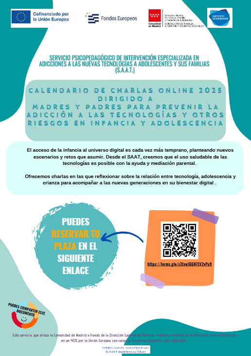 Queremos compartir con vosotros el calendario de las próximas charlas online programadas de febrero a julio de 2025 del Servicio psicopedagógico de intervención especializada en adicciones a las nuevas tecnológicas a adolescentes y sus familias de la Comunidad de Madrid.