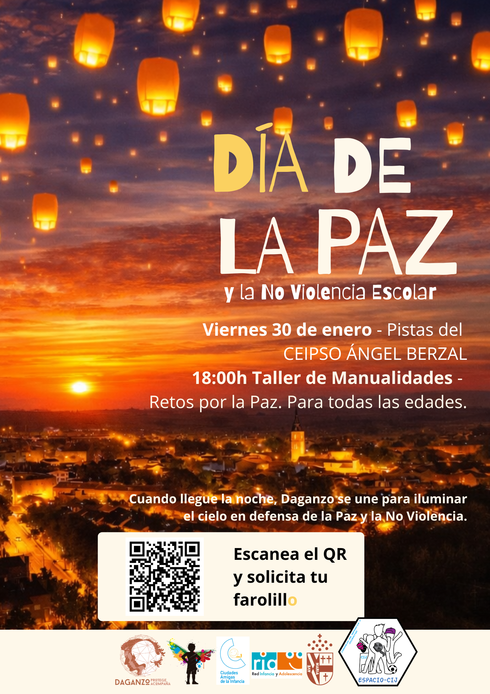 Durante la jornada se desarrollará Talleres de Manualidades: Retos por la Paz (para todas las edades), fomentando la reflexión y la participación activa de las personas asistentes y celebraremos un lanzamiento de Farolillos Luminosos Voladores, para ilumniar el cielo de Daganzo en defensa de la PAZ.