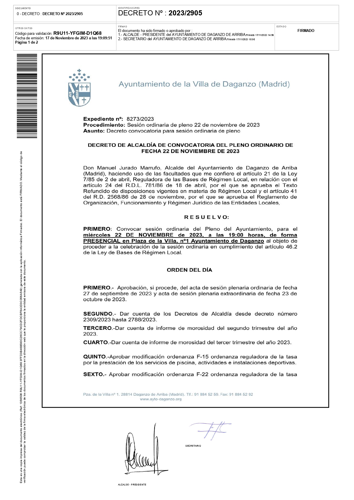 DECRETO DE ALCALDIA DE CONVOCATORIA DEL PLENOORDINARIO DE FECHA 22/11/2023