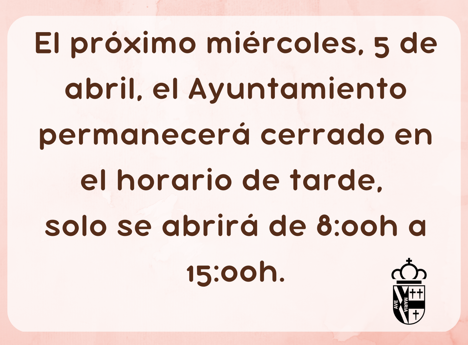 Mañana, miércoles 5 de abril, el Ayuntamiento permanecerá cerrado en el horario de tarde, solo abrirá de 8:00h a 15:00h.