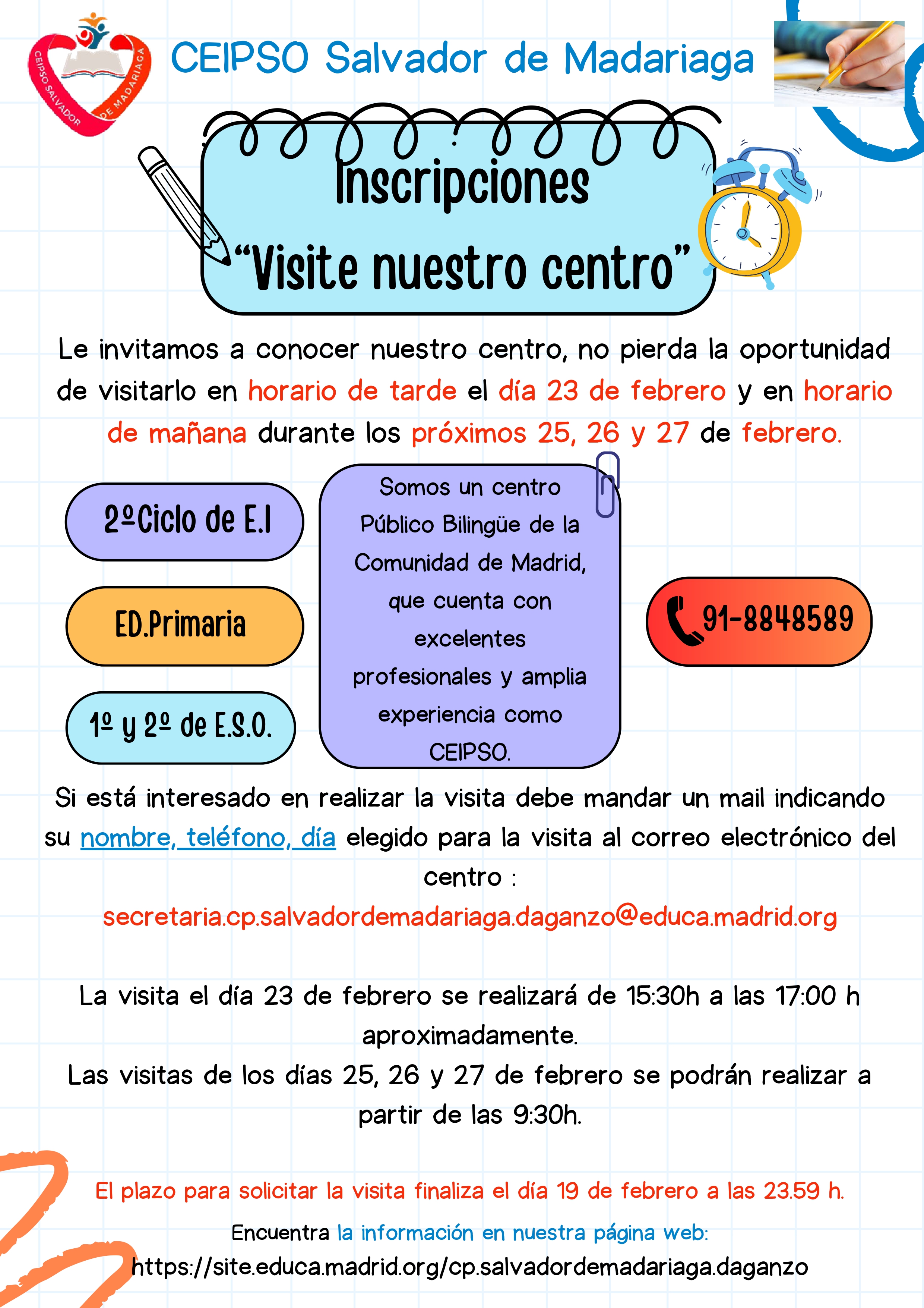 Adjuntamos el cartel del CEIPSO Salvador de Madariaga, donde encontrarán toda la información detallada sobre su próxima jornada de puertas abiertas.