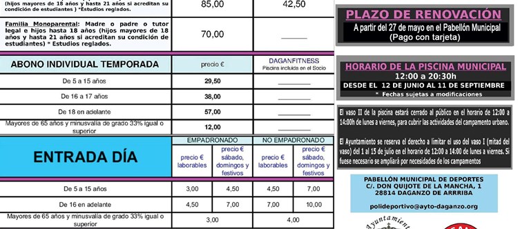 LA VENTA DE ABONOS DE LA PISCINA ES EXCLUSIVO PARA EMPADRONADOS Y SOLO SE INCLUYE LA UNIDAD FAMILIAR.