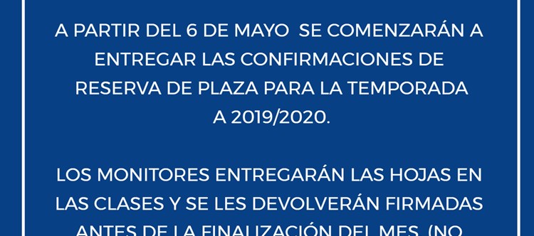 A partir del día 6 de mayo se comenzará a entregar en las Escuelas Deportivas por parte de los monitores las hojas de reserva de plaza para la temporada 2019/2020.