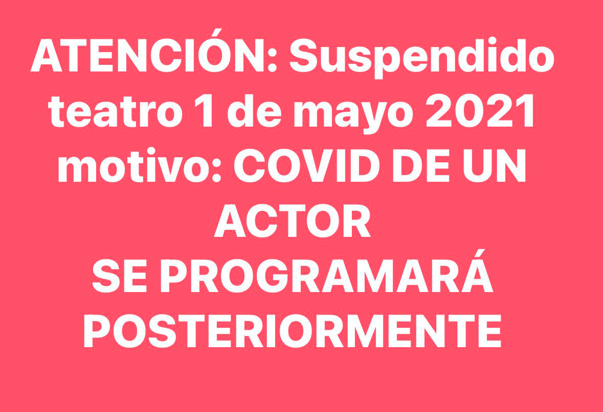 Se suspende lamentablemente la obra de teatro programada para el próximo sábado 1 de mayo 2021. El motivo es el positivo de uno de los actores.
