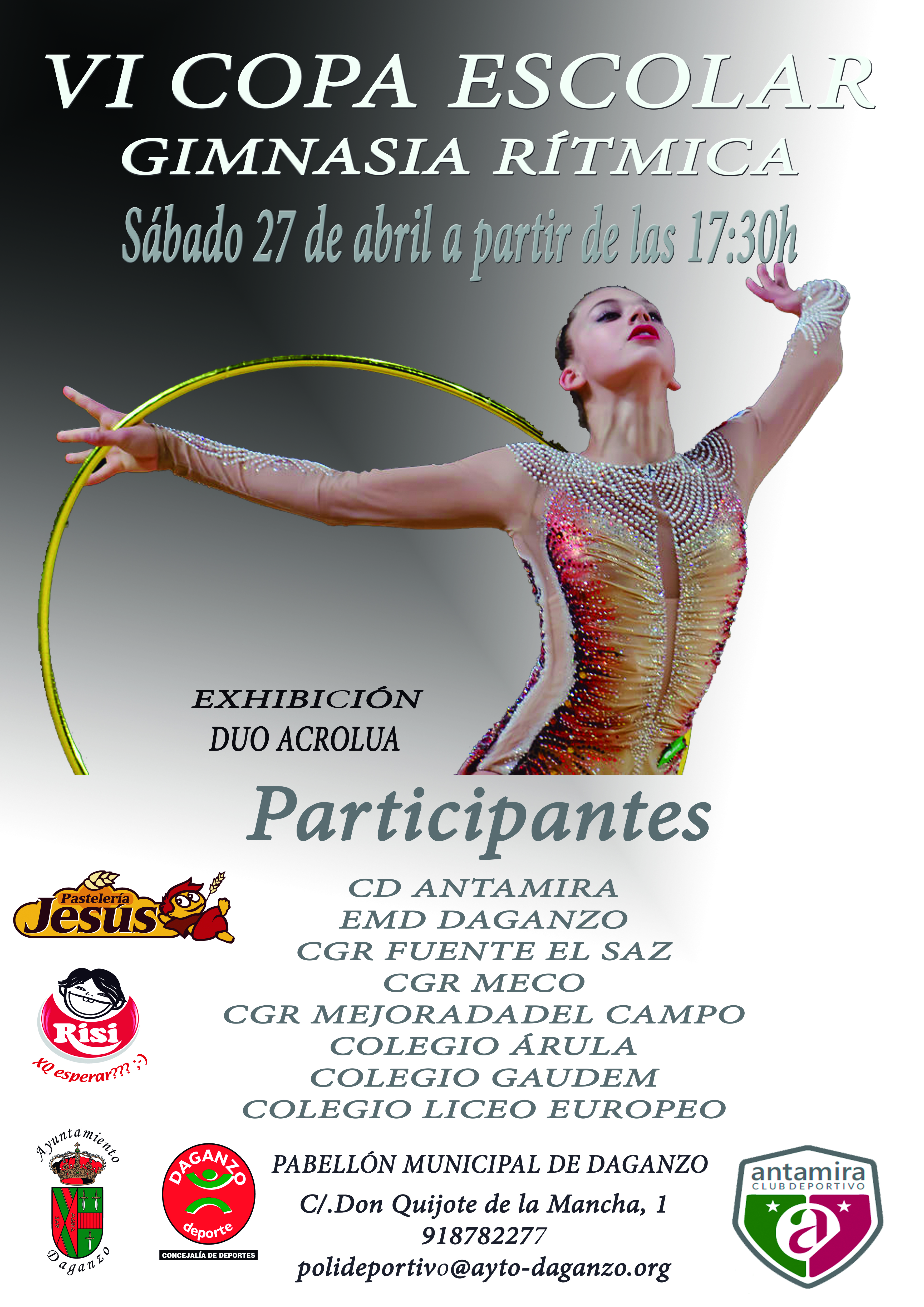 El sábado 27 de abril a partir de las 17:30 en el Pabellón Municipal se celebrará la VI COPA ESCOLAR DE GIMNASIA RÍTMICA, ORGANIZADA POR EL AYUNTAMIENTO DE DAGANZO Y EL CD ANTAMIRA y donde participarán distintos Clubs de la Comunidad de Madrid.